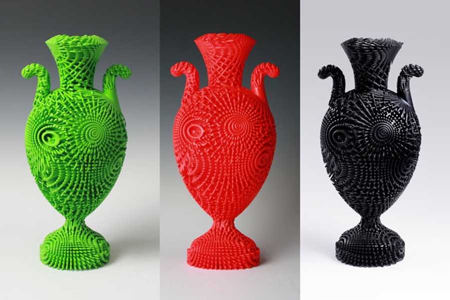 Стеклянные вазы – ещё одно интересное использование новой технологии. Правда на сегодняшний день в мире есть всего один принтер, способный на это, и принадлежит он «MIT ‘s Mediated Matter Group». В качестве основы для модели используется не пластик, как во всех остальных случаях, а стекло.