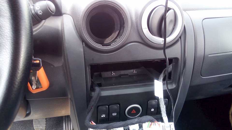 Итак, первое что надо сделать — снять магнитолу, можно поискать специальные съемники, но мы то не лыком шиты, гвозди нам в помощь. Одновременно с магнитолой, снимаем воздуховод, левый или правый — выбирайте сами. Снимается достаточно просто, можно просто уверенно потянуть за саму решетку и снять ее и окантовку воздуховода, потом уже достать основу.
