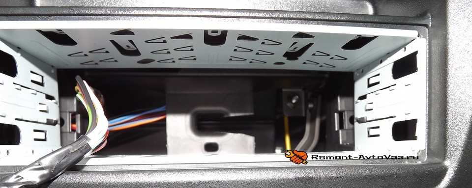 - Установить автомагнитолу в шахту для монтажа с помощью готовых скоб. Устройство зафиксировать в специальных точках, находящихся в панели.