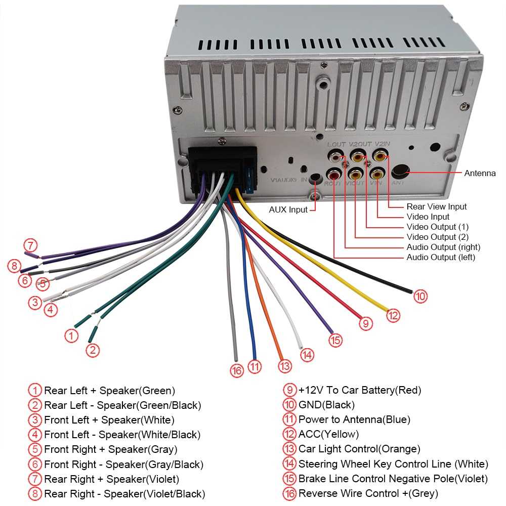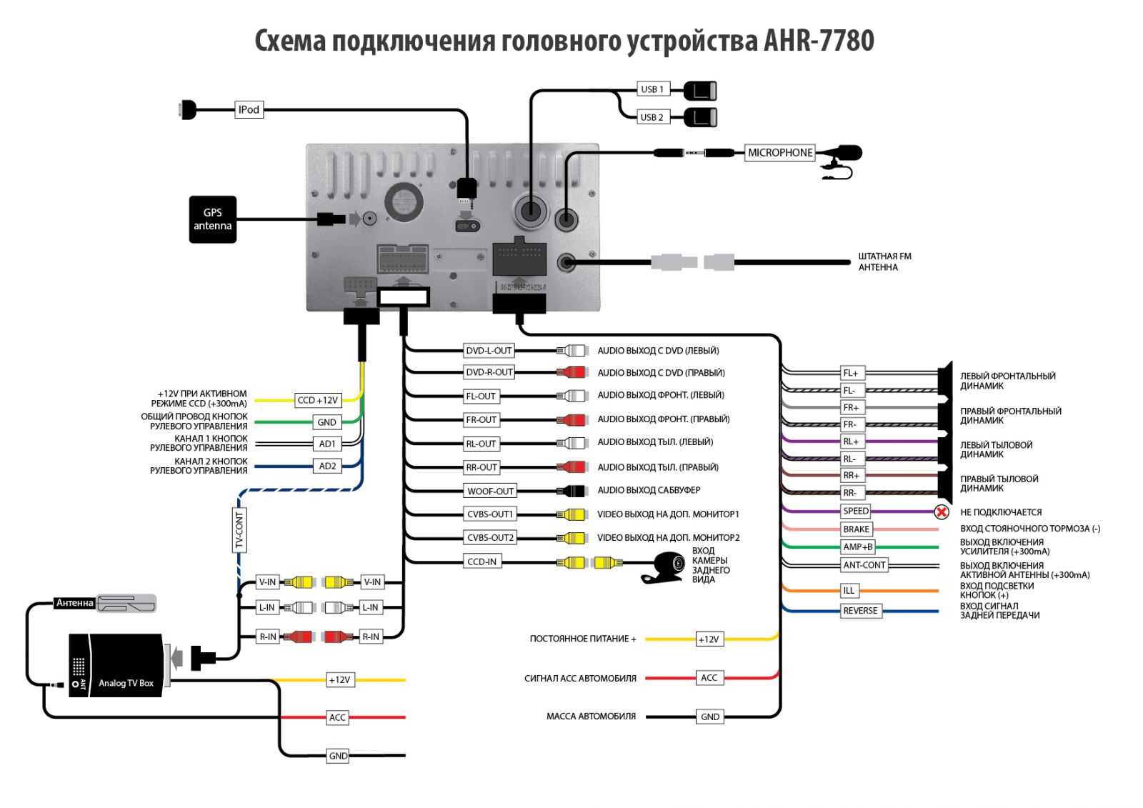 1. В черный цвет окрашивается минус аккумулятора, провод имеет маркировку GND. 2. Плюс аккумулятора всегда желтый, обозначается маркировкой BAT. 3. Плюс замка зажигания обозначается АCC и имеет красный цвет. 4. Провода левого переднего динамика имеют белый цвет, маркировка – FL. Минус имеет полосу. 5. Провода правого переднего динамика имеют серый цвет, маркировка – FR. Минус имеет полосу. 6. Провода левого заднего динамика имеют зеленый цвет, маркировка – RL. Минус имеет полосу. 7. Провода правого заднего динамика имеют фиолетовый цвет, маркировка – RR. Минус имеет полосу.