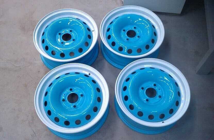 Обычно стальные диски, выполненные методом штампования, красят акриловой краской. Она может быть как матовой, так и глянцевой. Иногда водители пользуются нитрокраской, жидкой резиной, алкидно-меламиновыми суспензиями, порошковыми составами. Все перечисленные краски продаются в магазине в виде, часть (кроме порошковых) – в аэрозольных баллончиках.