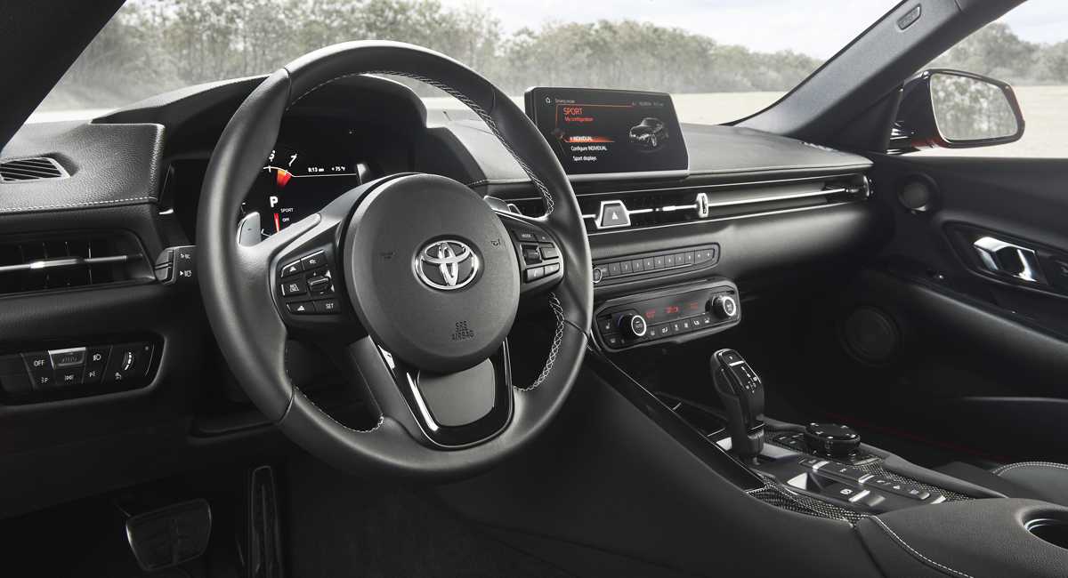 Салон новой Тойоты Супра 2020 по своей компоновке напоминает салон БМВ, поэтому здесь тот же центральный 12,3-дюймовый тачскрин, способный работать с Android Auto и Apple CarPlay, но в японском исполнении он торчит над панелью. На центральном тоннеле – очень похожий рычаг трансмиссии и такая же знакомая шайба.