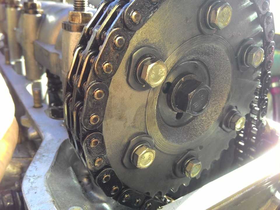 Метка на звезде РВ должна совпасть с отливом на корпусе. Если этого не произошло, выкручиваем болт, снимаем шестерню и смещаем цепь на один зуб в необходимую сторону.