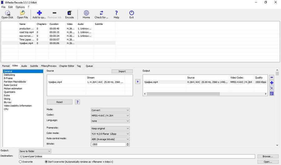 При сохранении XMedia Recode автоматически переименовывает клипы, чтобы не перезаписать оригинальный файл. К сожалению, ПО не переведено на русский язык, но благодаря простому интерфейсу освоить функционал не составит труда.