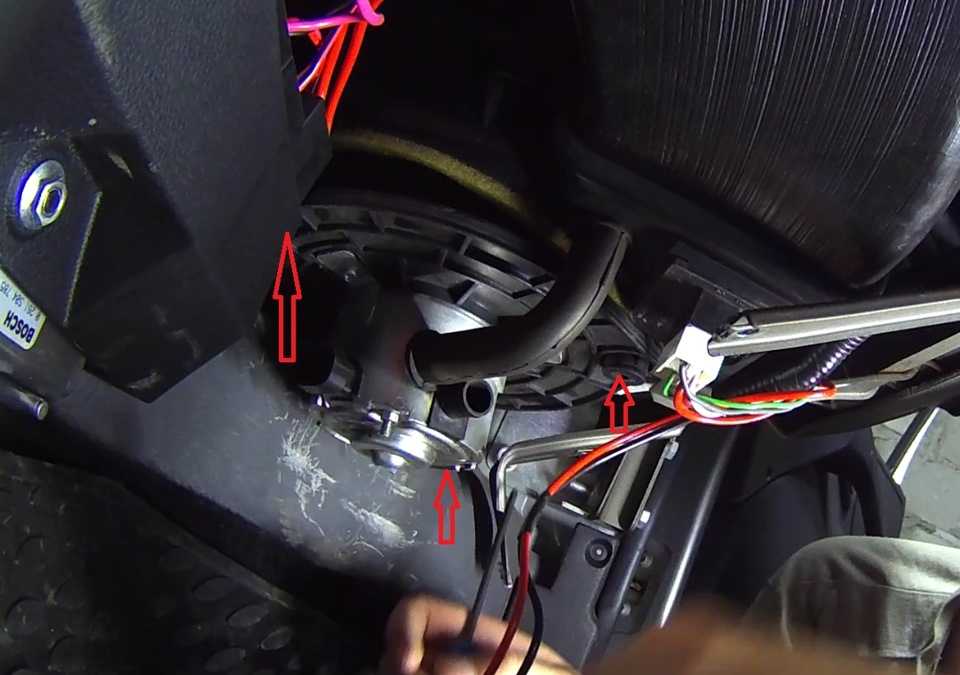В итоге моторчик можно будет двигать вверх-вниз, но вытащить его не выйдет.Лезем в воздухозаборник и откручиваем там 4 гайки (не забудьте поймать винты!)