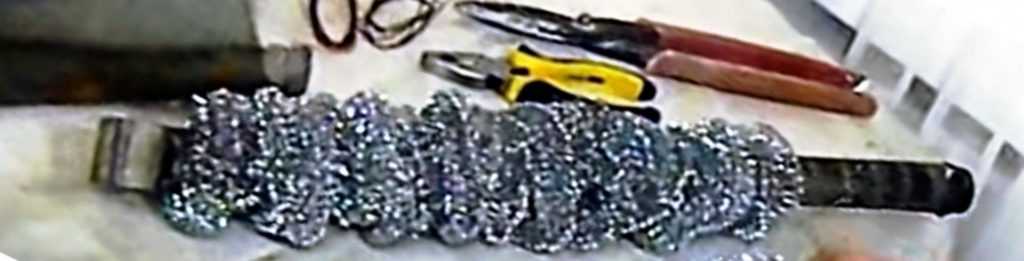 Плотно обкручиваем кухонные сеточки металлической сеткой в 1–3 слоя. Сетку фиксируем отожжённой стальной проволокой с множественной перекруткой или обжимаем несколькими хомутами.