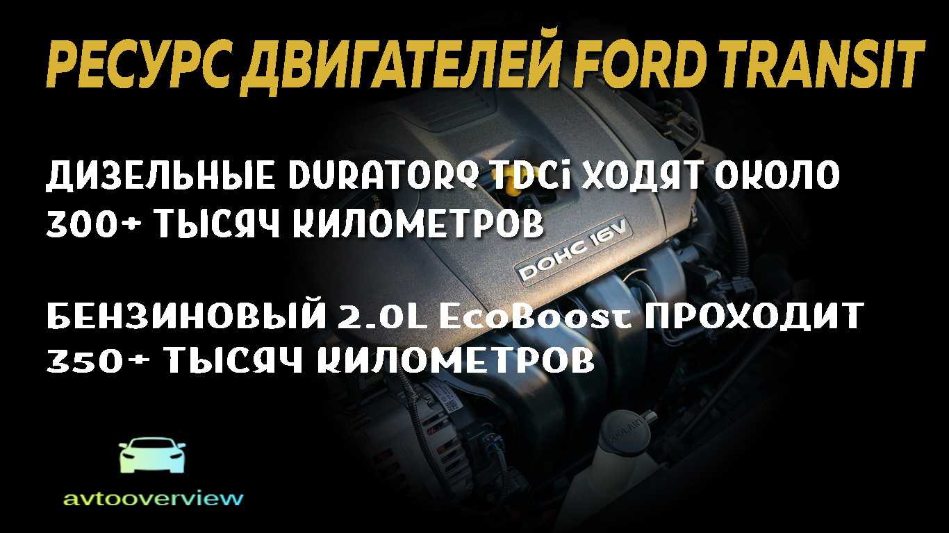 По неофициальным данным ресурс дизельных двигателей составляет 300 тысяч километров. Сам завод изготовитель на этот счет не дает комментариев. Практика эксплуатации Ford Transit показывает, что цифра в 300 тысяч километров пробега, покоряющаяся фургоном, является своеобразным минимумом. Версия авто с бензиновым 2.0L EcoBoost мотором способна пройти 350 тысяч километров до первого серьёзного ремонта.