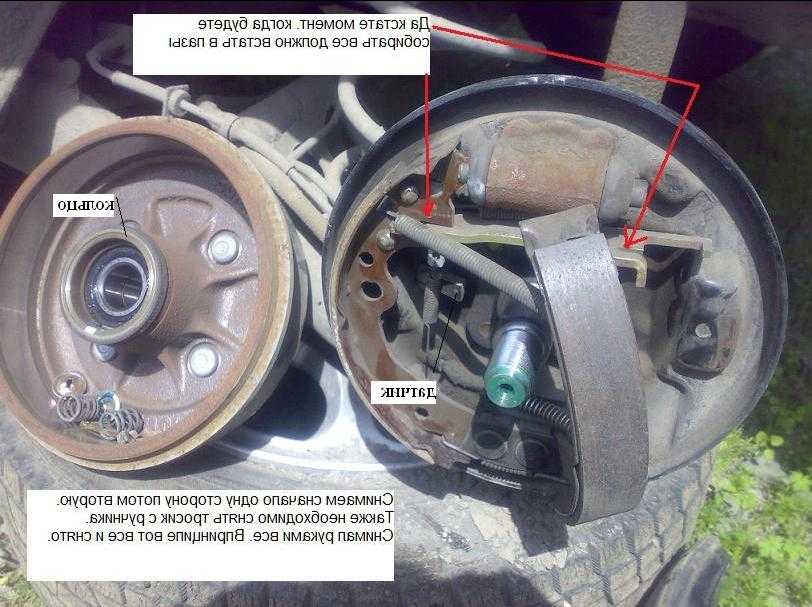 . с усилием проворачиваем барабан назад, сдвигая верхний конец передней колодки внутрь колесного цилиндра.