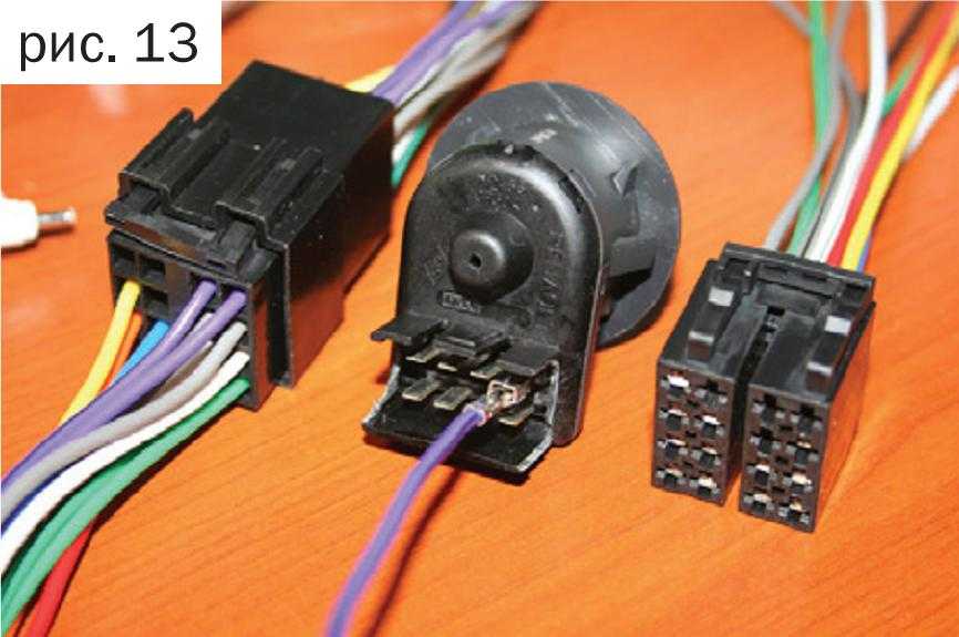 Установка. Снимаем обшивки передних дверей с динамиками и декоративную панель-накладку посередине консоли («бороды»). Потом снимаем пластиковый чёрный кожух и накладку тоннеля пола, затем снимаем кожух, в котором находится тело прикуривателя. Разъем для джойстика я изготовил за 15 мин., подошёл идеально, и даже удалось соблюсти цветовую схему (рис.13)
