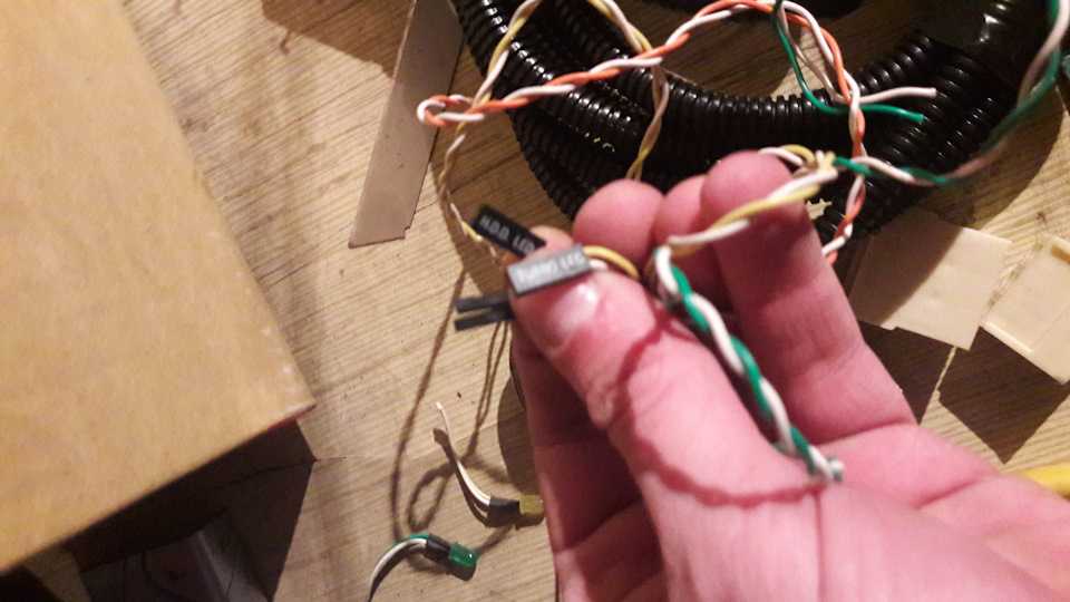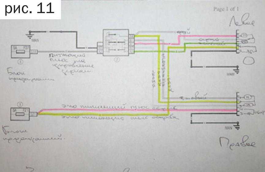 После того, как сняли верхнюю накладку рулевой колонки, козырёк приборной доски и саму «приборку», протягиваем провода через гофры — вдоль штатных проводов от ЦЗ и/или акустики. Левые провода тянем под приборную доску, 2 провода подогрева оставляем там, ещё 3 (жёлтый, синий, зелёный) тянем к рычагу стояночного тормоза. Правые прокладываем аналогично, жгуты проводов армируем изолентой пгофры, провода, о кругу.