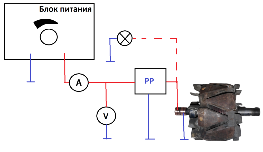 Провод который идет на реле регулятор необходимо замкнуть на массу. Включить зажигание. Лампочка должна загореться. Это означает что нет контакта между щетками и контактными кольцами. Либо произошел обрыв в обмотке ротора.
