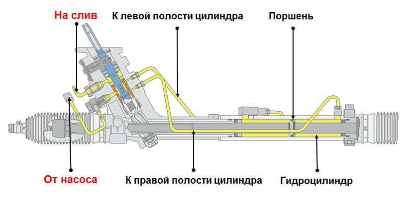 Гидроусилитель руля устанавливается на любого типа. Для легковых автомобилей наибольшее распространение получил реечный механизм. В этом случае схема ГУР следующая: