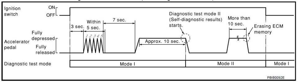 Вот как это описывается в оригинале:How to Set Self-diagnostic Results ModeNOTE:• It is better to count the time accurately with a clock.• It is impossible to switch the diagnostic mode when an accelerator pedal position sensor circuit has a malfunction.• After ignition switch is turned off, ECM always returns to the diagnostic test mode I.1. Confirm that accelerator pedal is fully released, turn ignition switch ON and wait 3 seconds.2. Repeat the following procedure quickly five times within 5 seconds.• Fully depress the accelerator pedal.• Fully release the accelerator pedal.3. Wait 7 seconds, fully depress the accelerator pedal and keep it depressed for approx. 10 seconds until theMIL starts blinking.4. Fully depress the accelerator pedal.ECM has entered to the diagnostic test mode II (Self-diagnostic results).