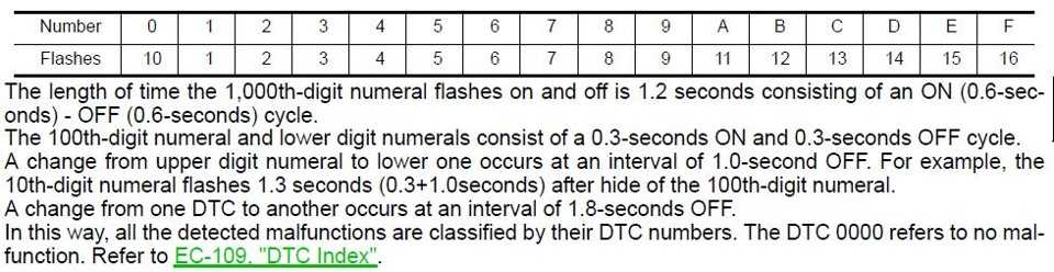 Режим самодиагностики (чтение ошибок ЭБУ), он аналогичен T31. Мануал рекомендует использовать при этих манипуляциях секундомер.1. Включить зажигание, подождать 3 секунды.2. В течение 5 секунд полностью нажать и отпустить педаль газа 5 раз.3. Ждать 7 секунд.4. Нажать на педаль газа и держать, пока не начнет мигать индикатор «чек эджин» (примерно 10 сек), потом отпустить педаль газа.5. Считываем коды ошибок по миганиям индикатора.