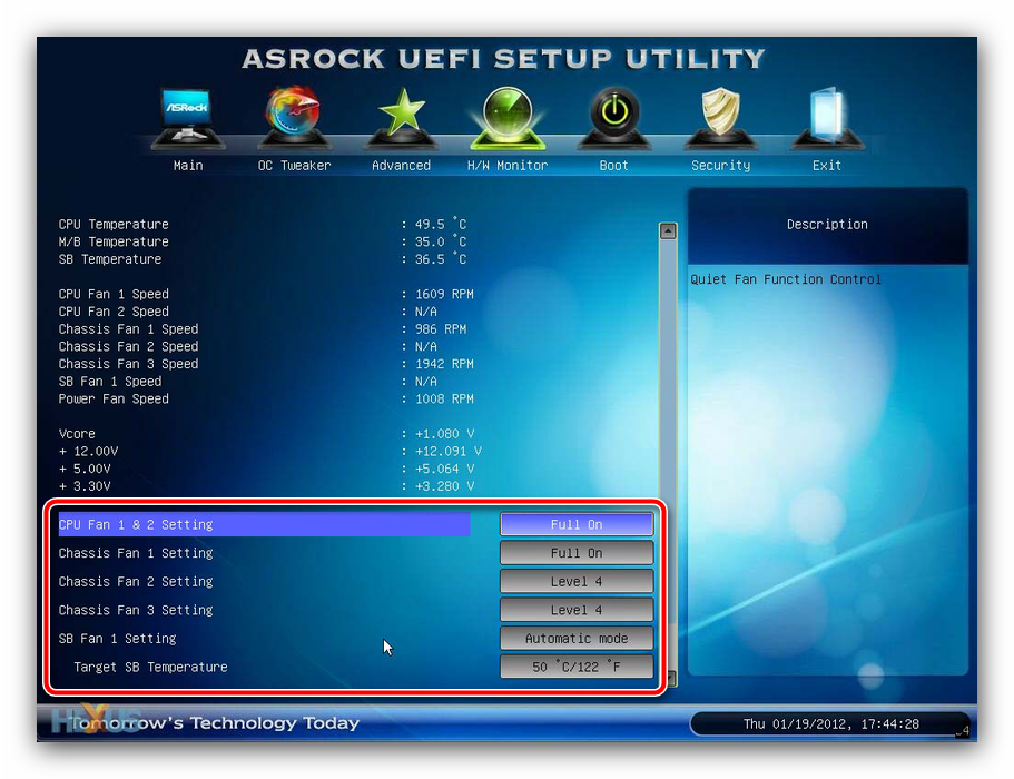В некоторых продвинутых UEFI доступна отдельная настройка скорости вращения вентилятора для разных температур CPU – обычно этот параметр называется «Fan Speed for Temperature». Таких, как правило, несколько, в среднем три, значения для каждого настраивается отдельно. Дело в том, что кулер может не работать в случаях, когда тут установлены слишком высокие лимиты – например, охлаждение не будет включаться при нагреве ЦПУ меньше или равному 60 градусам Цельсия (или эквиваленту в градусах Фаренгейта). Значения стоит уменьшить – выберите в пункте «Temperature» желаемое число, затем в «Fan Speed for Temperature» установите скорость работы (в оборотах в минуту или в процентах).