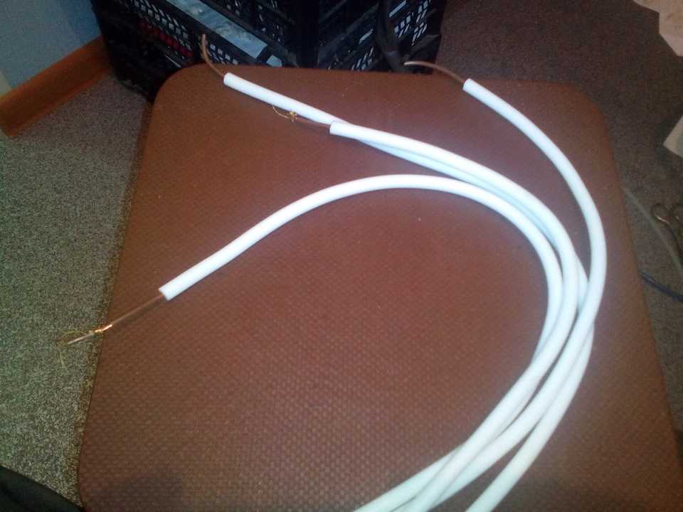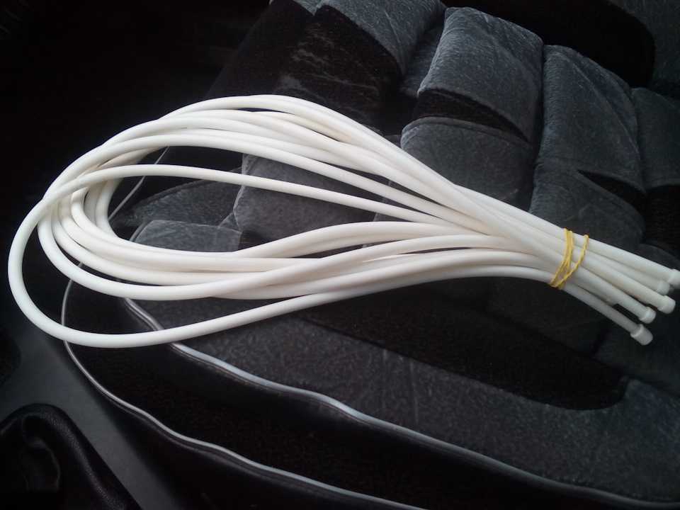 Далее, нарезал трубку по размерамДля того, чтобы просунуть провод в трубку использовал жидкий ключ, силиконовую смазку. Провод просто так не пошел, под моим натиском, заходит на 5-7 см и все. Протягивал провод с помощью плетенки от спиннинга, привязывал к проводу и со смазкой протягивал провод плетенкой. Получилось быстро и легко. И провод сидит очень плотно в оплетке! Вот они)) Потом нужно будет обрезать провода, чтобы все было эстетично, красиво и функционально))