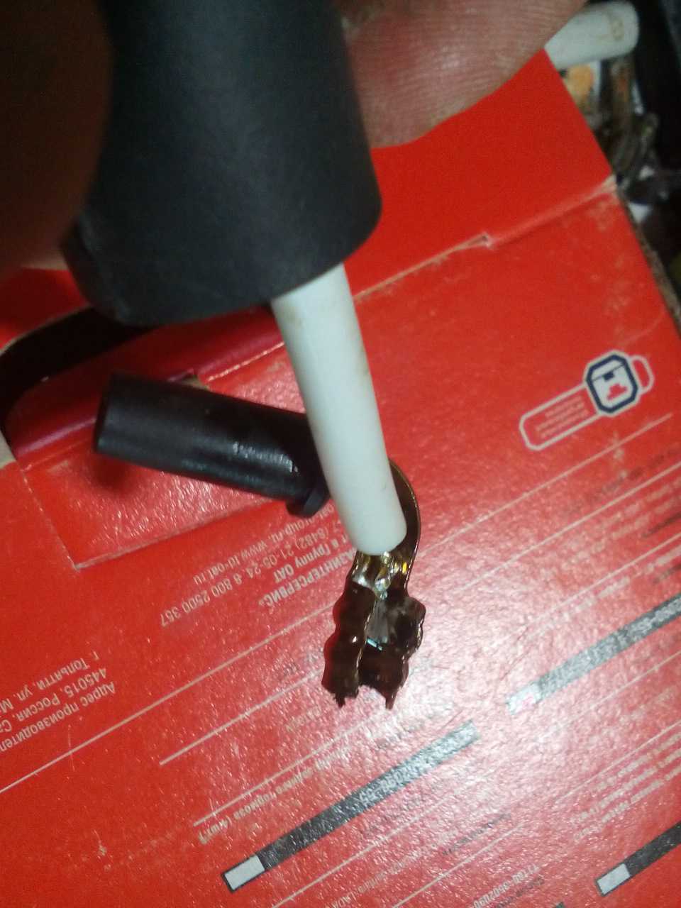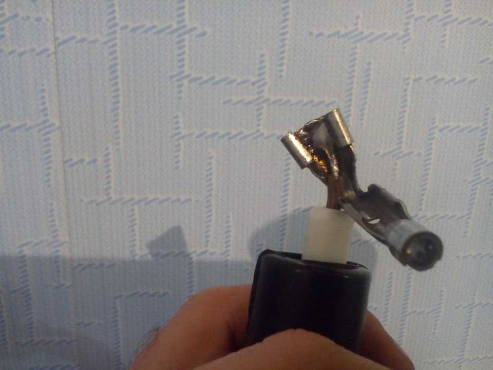 Далее, натягивал резиновые пыльники на провода и паял наконечники (на фото видно, как нужно подрезать провод). После пайки обжимал наконечник.
