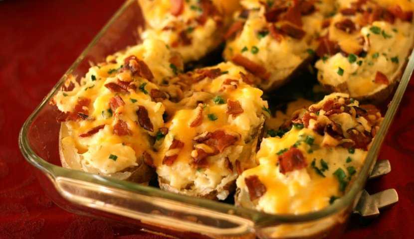 - Внутрь картошек укладывается начинка, а затем блюдо ставится в духовку на 10 минут до появления корочки.