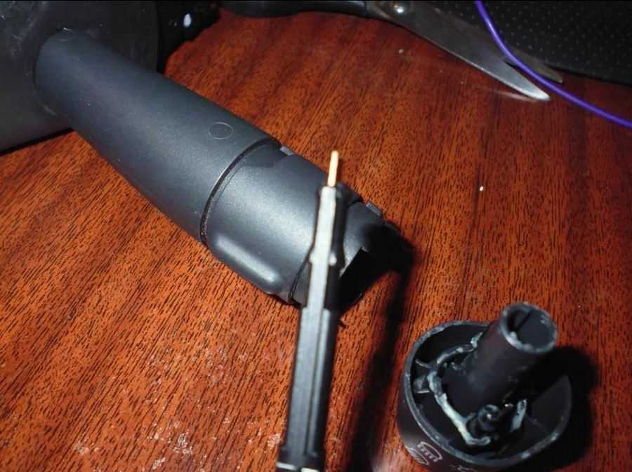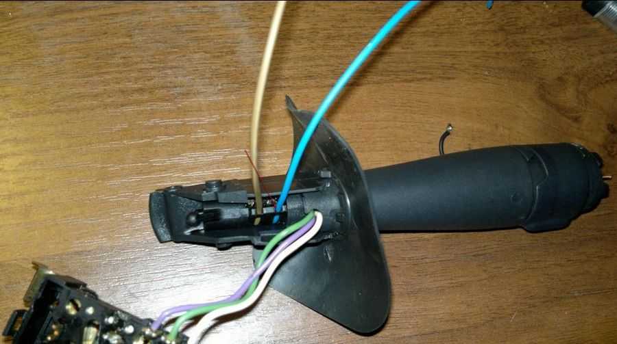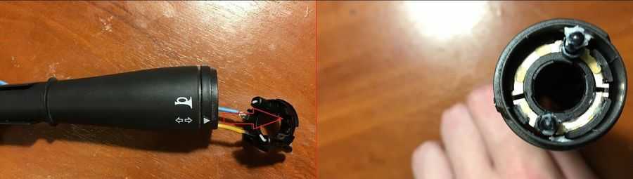 Сняв рычаг в сборе внимательно осматриваем, особенно надо обратить внимание на провода. У меня сразу было видно, что обломаны провода чёрный и красный, припаянные к штырю, который находится внутри самого рычага
