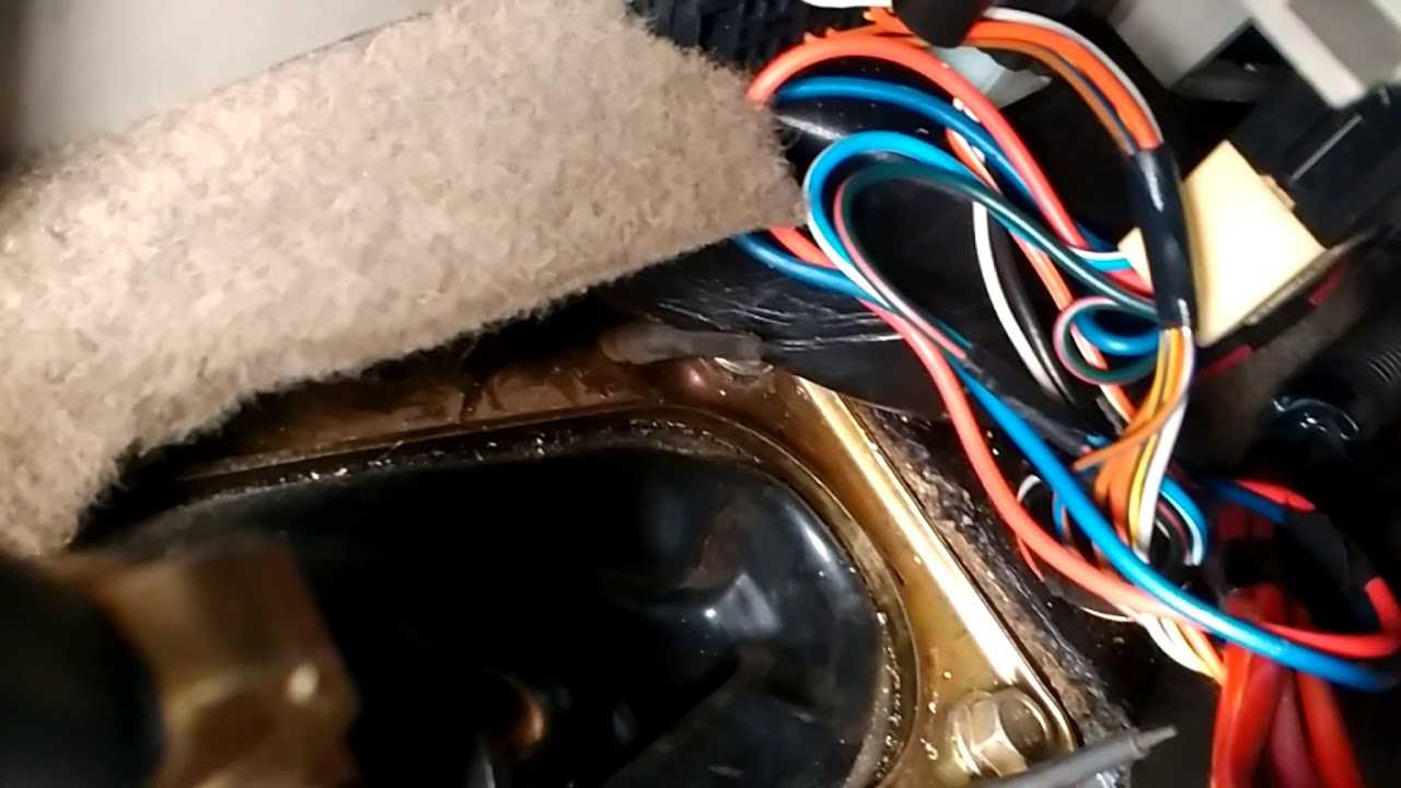 Накладная металлическая пластина крепления обоймы удерживается четырьмя болтами по углам, которые необходимо вывернуть. Доступ к левому переднему болту перекрыт тоннелем воздуховода, который придется снять, либо подвинуть с помощью лопатки или отвертки чуть влево, для возможности работы рожковым ключом. Далее отворачивается болт, скрепляющий рычаг выбора передач с проушинами кулисы. После этого необходимо продолжить работу под днищем автомобиля (см. соответствующий раздел).