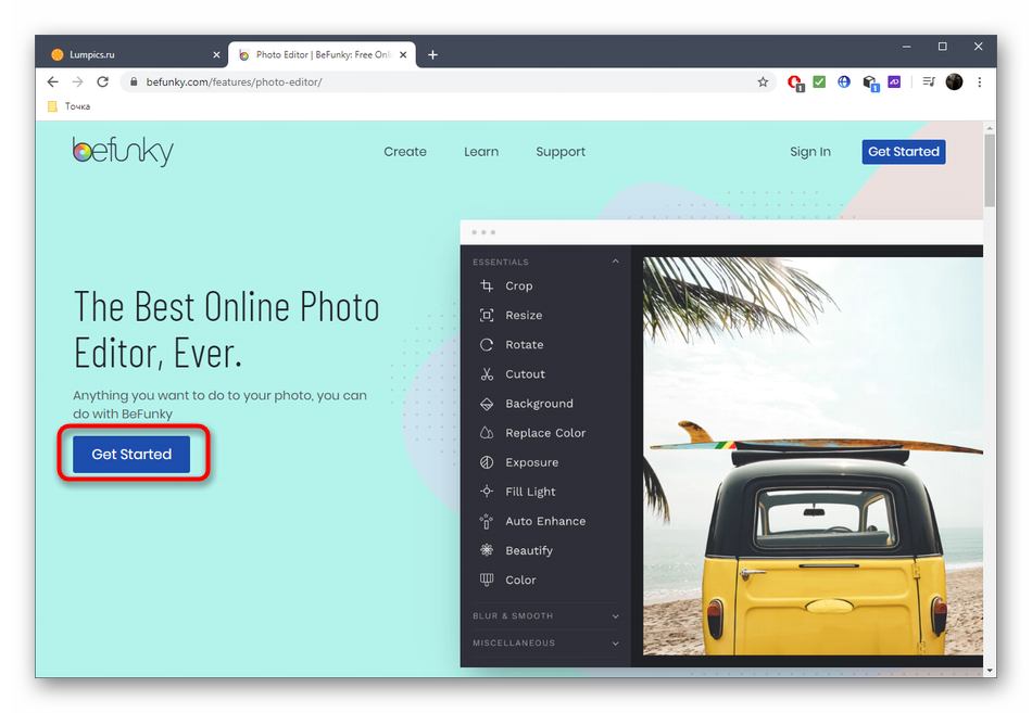 - Откройте главную страницу сайта BeFunky, где щелкните по кнопке «Get Started».