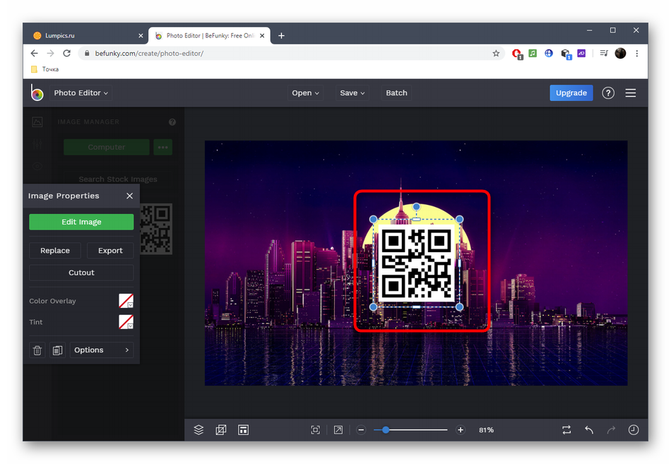 После того, как логотип был наложен удачно, займитесь дополнительным редактированием картинки при помощи стандартных средств BeFunky, если это требуется.