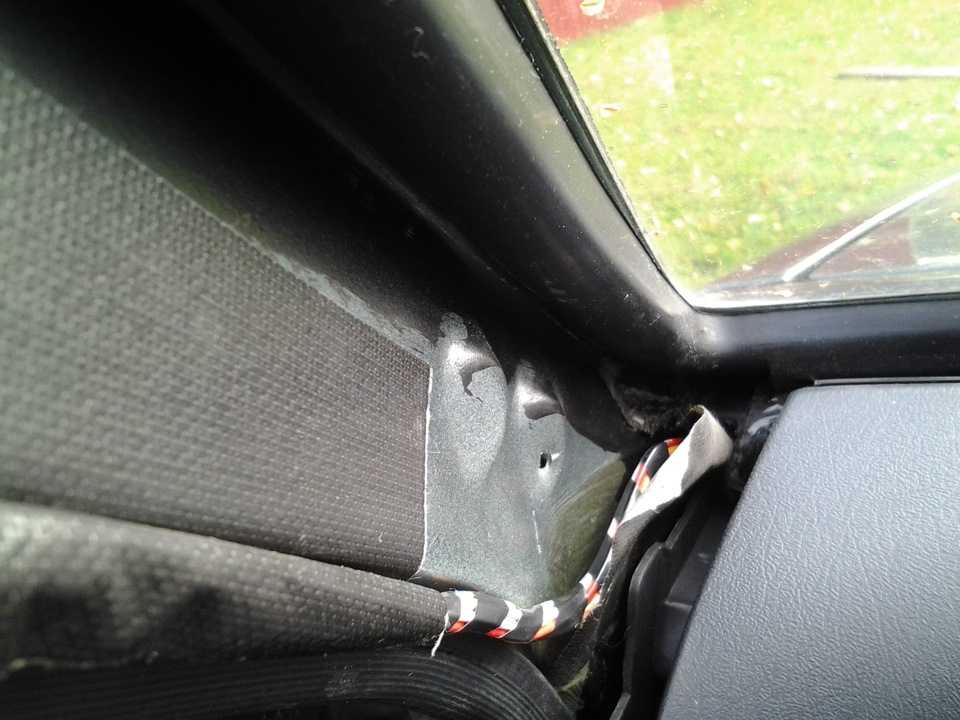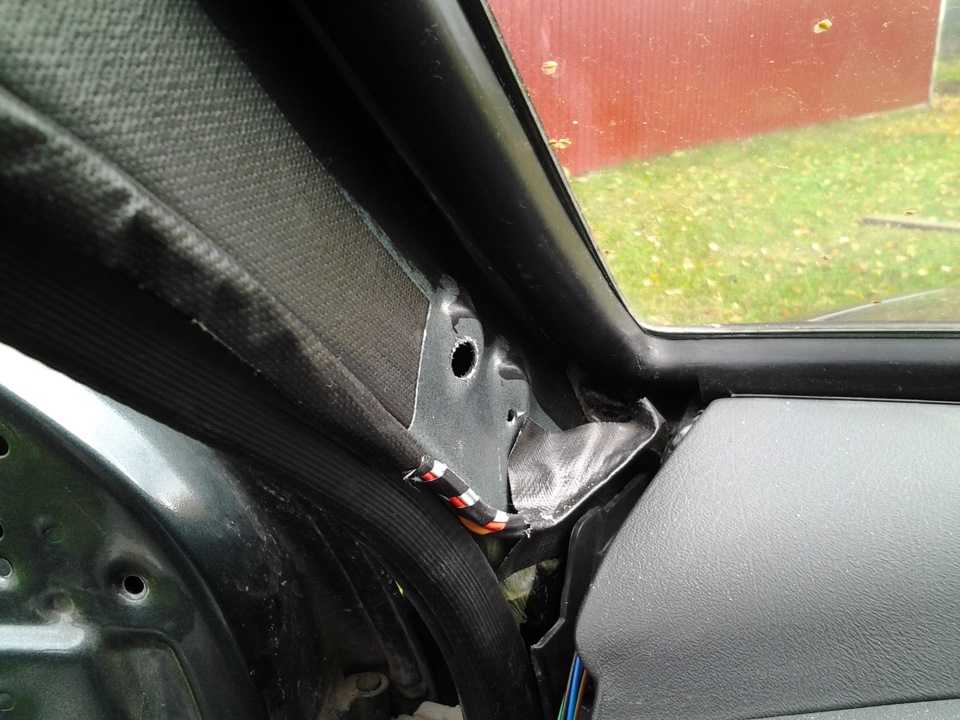 После снимаем декоративную планку со стойки водителя и делаем отверстие в той же стойке, куда будем прокладывать проводку. Сверлить не очень удобно, я сверлил в 3 сверла, конечный диаметр 10 мм.