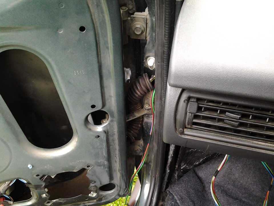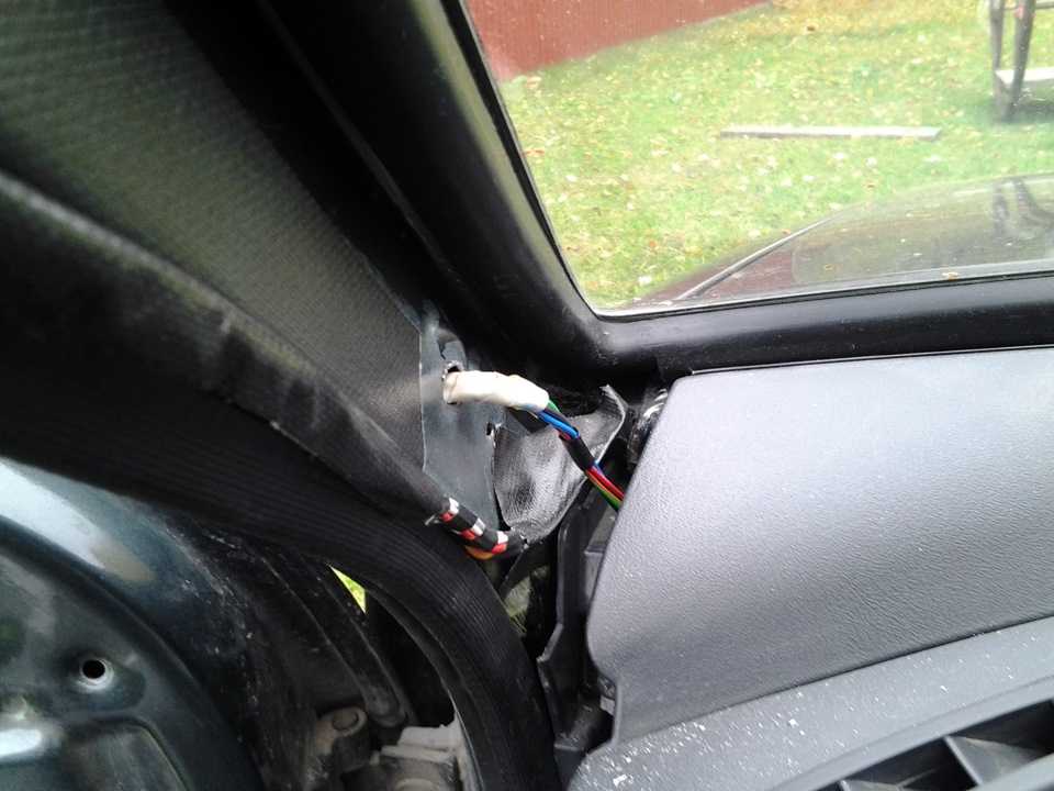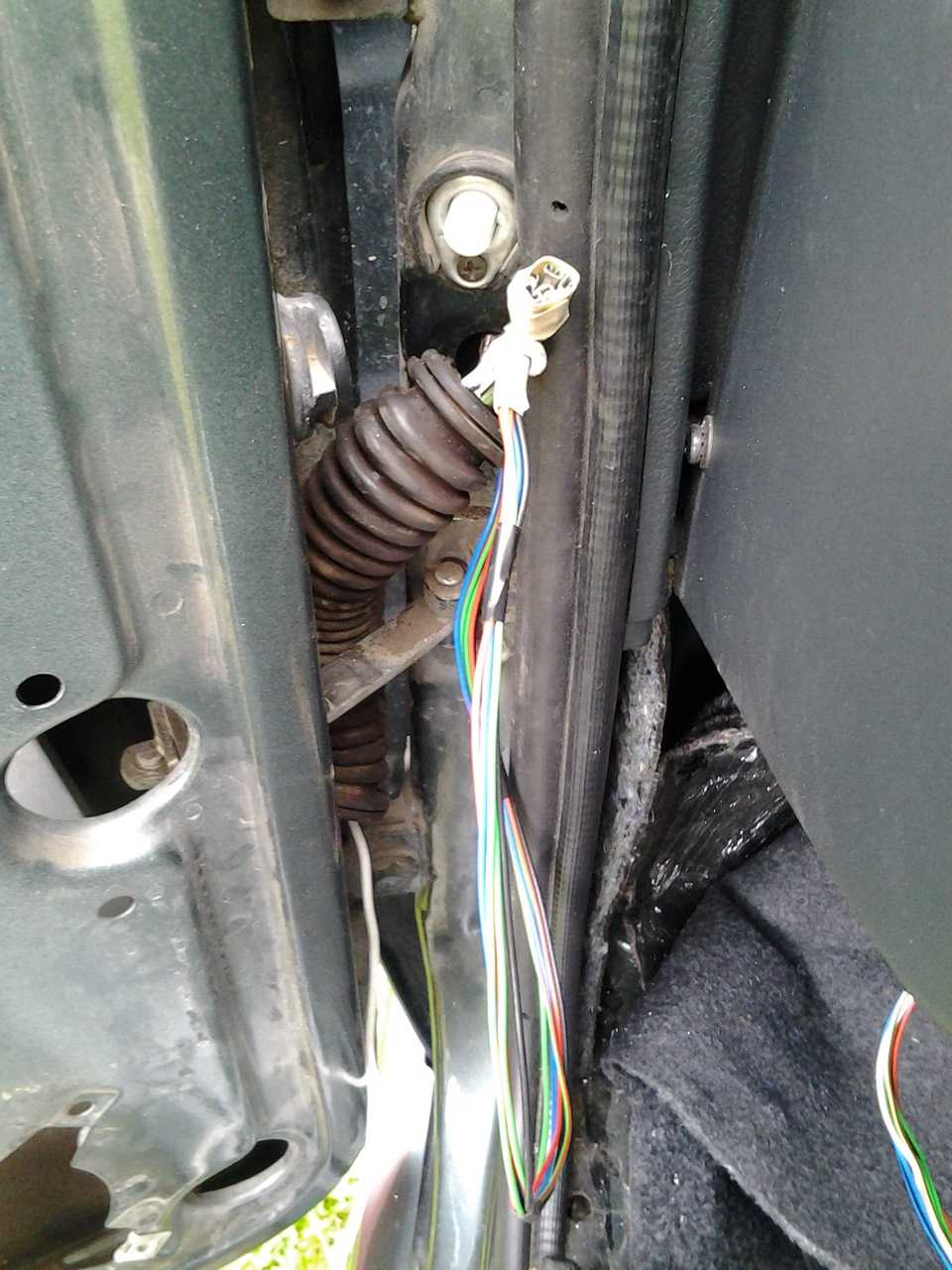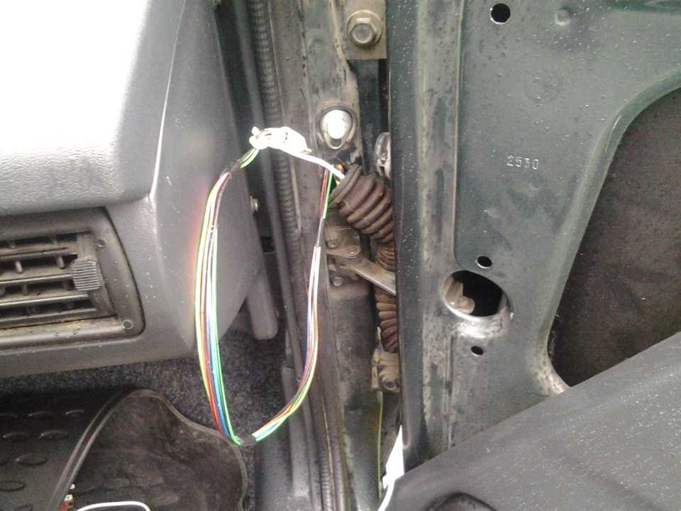 Проводка будет проходить вместе с проводами стеклоподъемника, т.е. под резиновой гофрой между дверью и кузовом. Снимаем обшивку двери, отгибаем гофру, берем в меру гипкий/жесткий провод, продеваем через гофру, приматываем нашу проводку к нему и вытягиваем с другой стороны.
