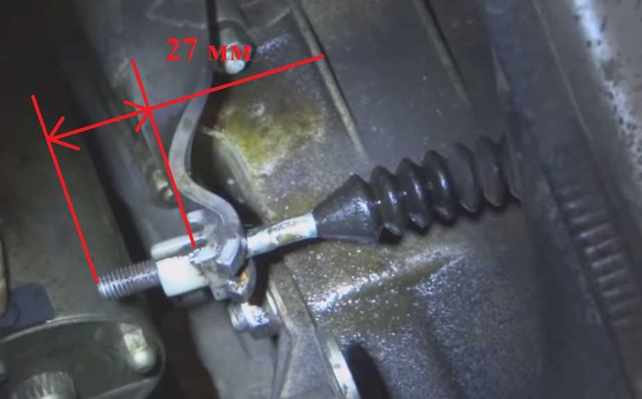 Взяв линейку или тот же штангенциркуль, выполняем замер расстояния. На фото четко обозначен отрезок, подлежащий замеру: между началом вилки и поводком троса. Для корректного замера потребуется удержать трос в неподвижном и определенном положении. Идеальным результатом замера будет значение в 27 мм. Когда потребовалась регулировка сцепления, то фактический параметр будет отличаться от заявленного эталона. Для достижения потребного значения (27 мм) вращаем поводок троса.