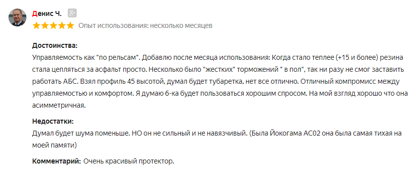 Эта резина не подвержена аквапланированию и имеет качественный, износостойкий протектор. Несмотря на мягкие боковины шин машина чутко слушается каждого движения руля. Так что если вы готовы немного переплатить за качество, то смело берите эту модель.