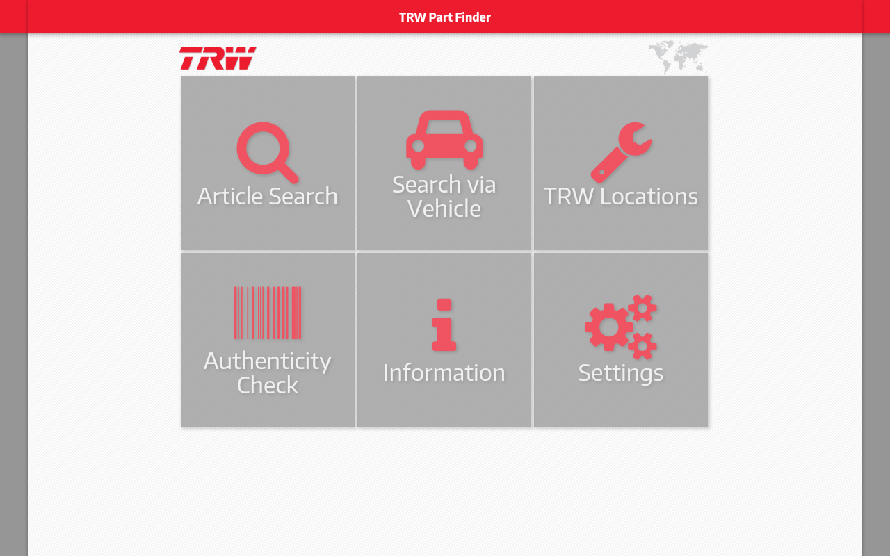 С помощью приложения «TRW Part Finder» покупатель сможет проверить оригинальность автомобильной запчасти. Приложение позволяет быстро облегчить поиск детали, и проверить подлинность по серийному номеру. «TRW Part Finder» прямой доступ к веб-каталогу германской компании. Как было отмечено выше для поиска достаточно вести номер оригинальной детали.