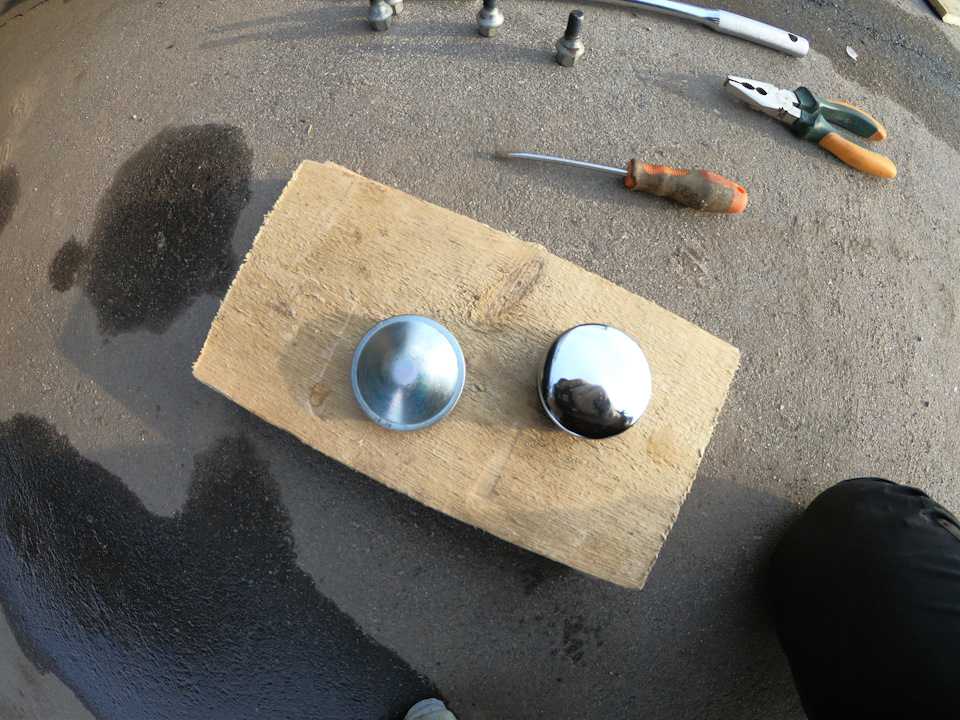 Задняя заглушка более алюминевая, передняя же как зеркало. Попробовал заменить родную заглушку на заднем колесе, но оказалось, что она немного больше диаметром и новая из неё тупо вываливается. Получается что назад нужно покупать большего диаметра, то есть 52-56мм вместо 48-52мм.В итое поставил сверху черные пластиковые заглушки.