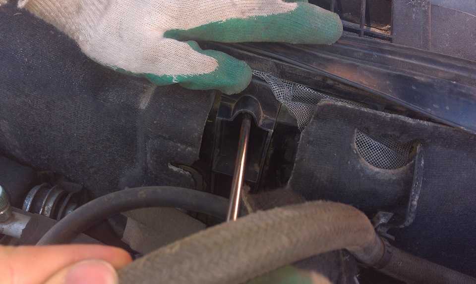 - Под капотом уберите пластиковую решетку. Открутите фиксирующие винты и отодвиньте ее в сторону.