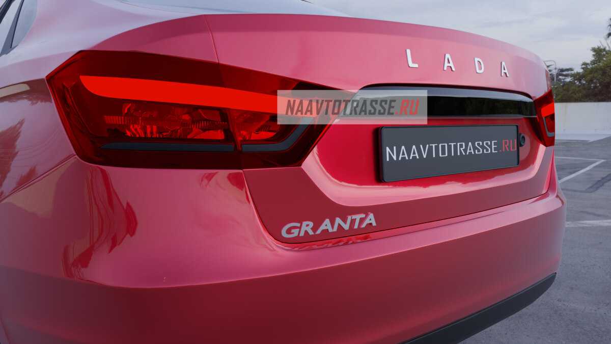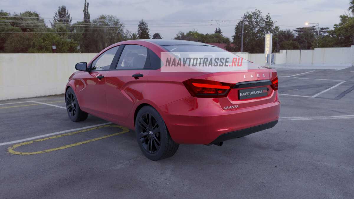 Кормовое остекление, в сравнении с серийной Granta, оказалось крупнее. При этом автомобиль не получил по примеру Vesta антенны «акулий плавник». Вытянувшаяся назад дверца багажника завершается незначительным выступом. Задняя оптика также была позаимствована у нынешней Vesta, но содержит она, скорее всего, светодиодные огни. Между кормовыми фонарями разработчики поместили пластиковую вставку, которая как бы подчеркивает надпись с названием марки Lada.