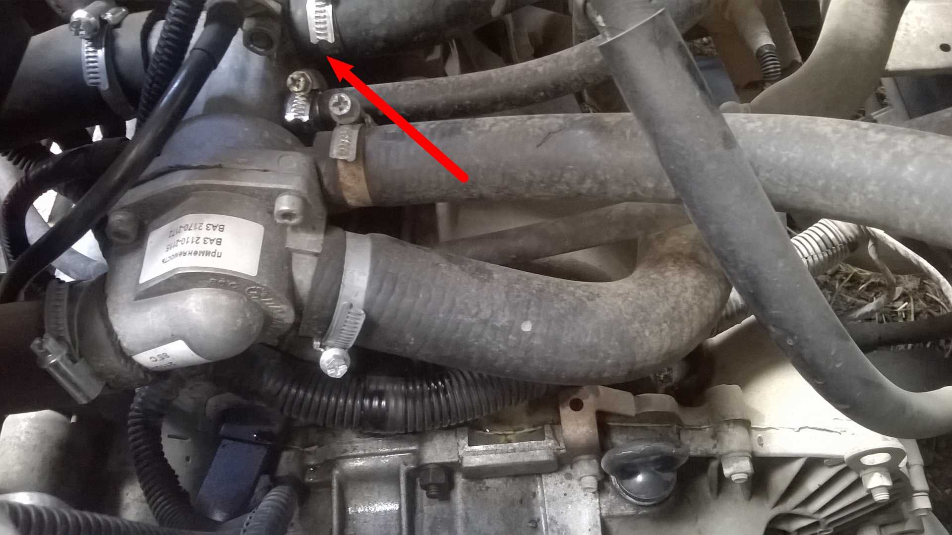 Термостат находится слева внизу двигателя. К нему отходит три патрубка. Когда стрелка на указателе дойдет до красной метки, дотроньтесь до термостата (в перчатке). Если шланг, который идет от него, будет холодным, значит, заслонка сломалась.
