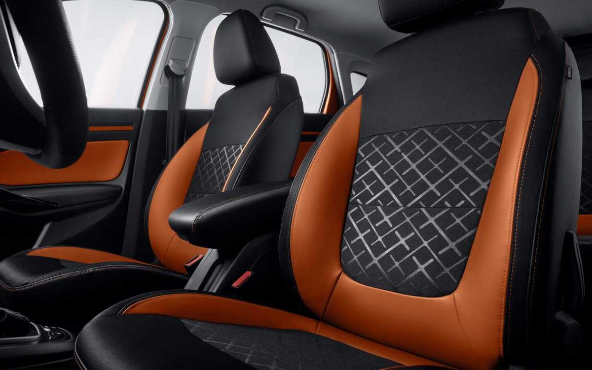В интерьере авто приковывают внимание контрастные элементы серых, оранжевых цветов. Контрастные элементы прослеживаются во всем интерьере новой модели