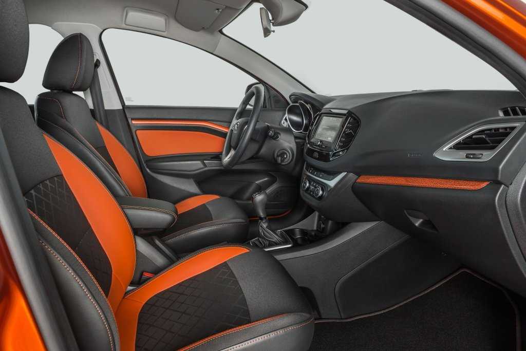 Дизайн интерьера также оказался достаточно классическим для всего модельного ряда Lada. Одним из отличительных моментов окажется использование декоративных цветных вставок в салоне. Центральная панель оборудована аналоговой панелью приборов, цифровым экраном системы мультимедиа и блоком управления климатической системой. Тоннель укомплектован подстаканниками, селектором управления КПП, рычагом стояночного тормоза и подлокотником. Кстати, разделительный подлокотник предлагается не только для передних, но и для задних пассажиров. Достаточно качественно исполнены кресла салона автомобиля. Они в меру жесткие, оснащены боковой и поясничной поддержкой, а также системой подогрева.