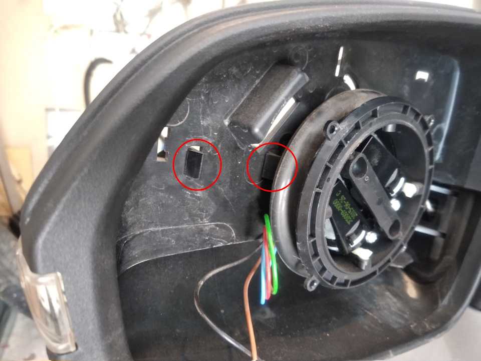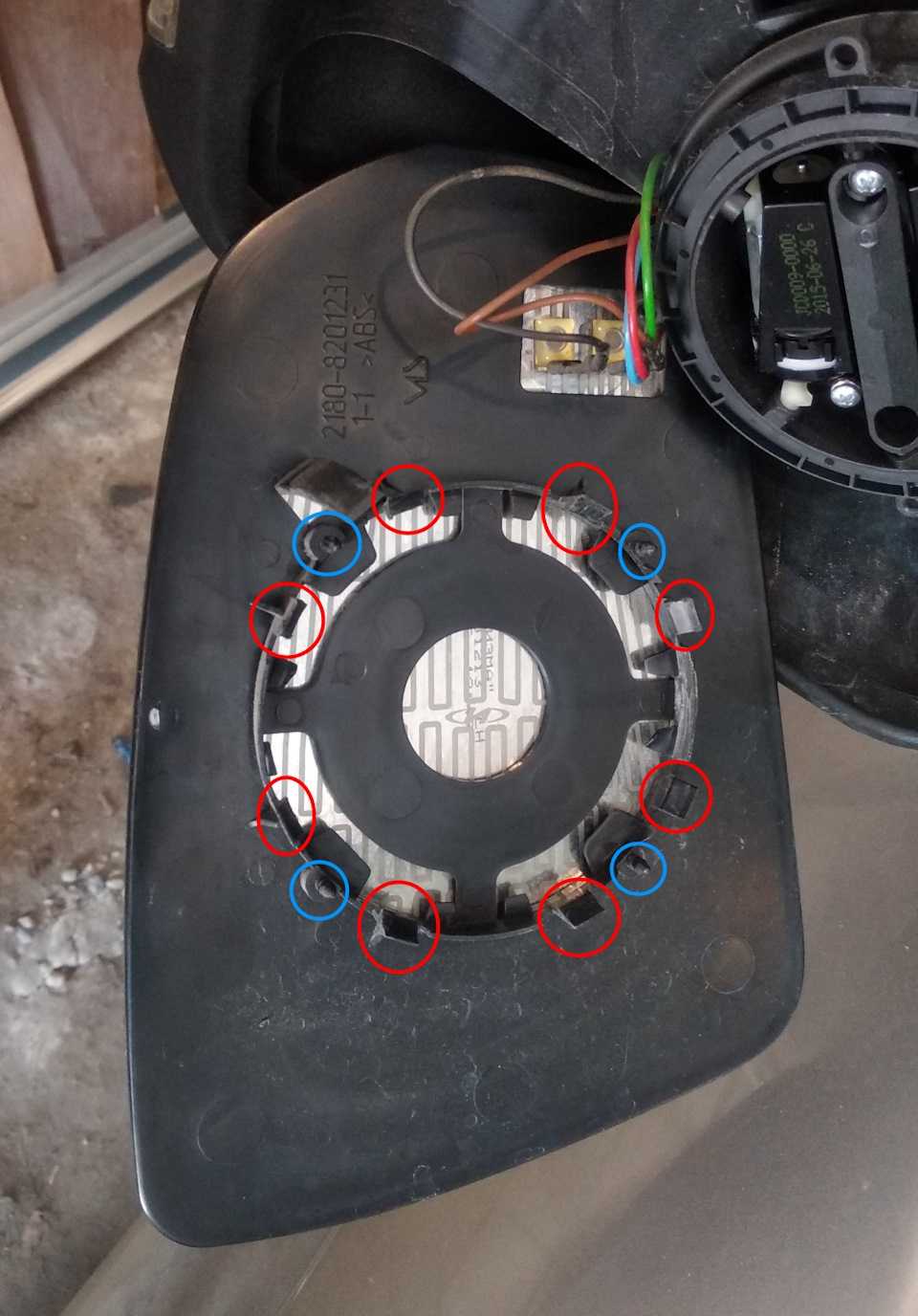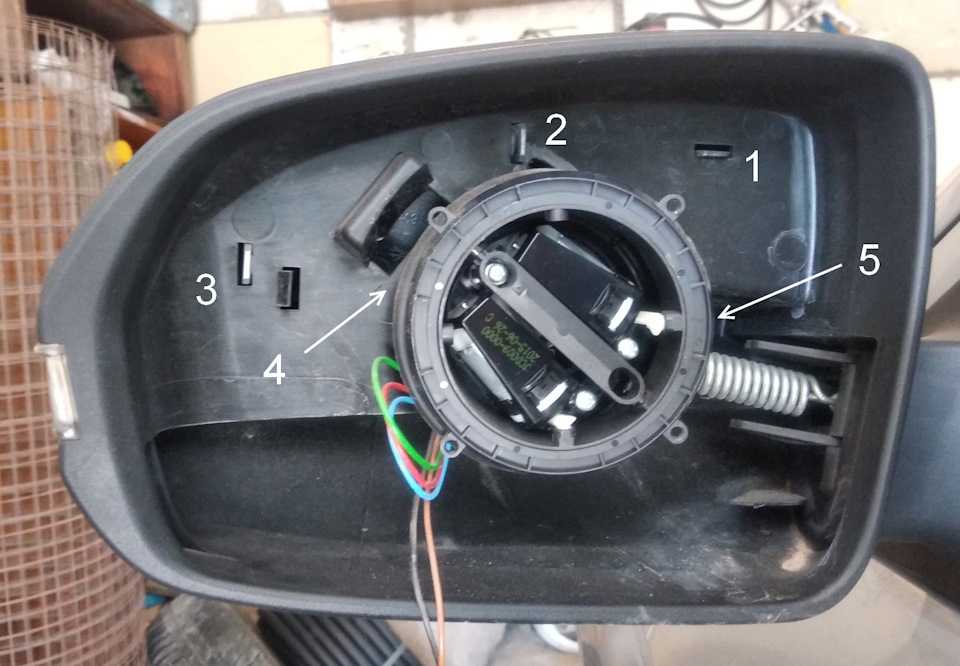 Тонкой отверткой отщелкиваем фиксаторы поочередно и вынимаем зеркало из корпуса. Если стекло с подогревом — отключаем две клеммы на термоэлементе. Теперь мы получили доступ к мотор-редуктору регулировки зеркала. Расположение фиксаторов указано на фото.