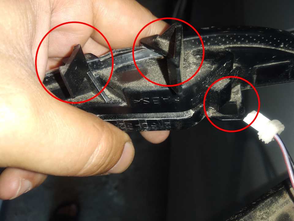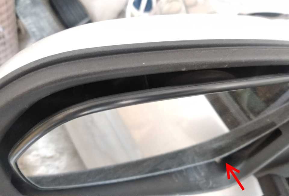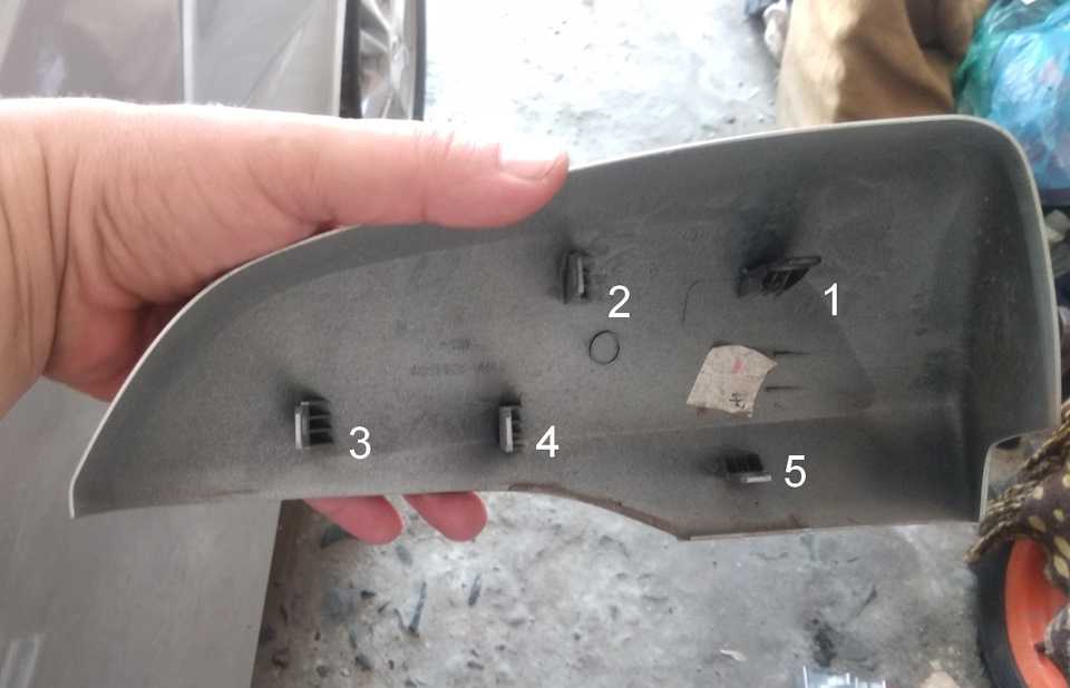 Второе зеркало разбирал быстрым способом. Но аккуратно, можно обломать защелки. Подлез я к ним длинной плоской отверткой. Для наглядности расположу фото снятой накладки (правда с другого зеркала) здесь же. Отщелкнул все, кроме 4й — слетает сама. К ней не подлезть. Все защелки целые. Если оставить две последних и снять накладку — могут сломаться! До пятой можно добраться, вывернув зеркало полностью наружу (сложив в обратную сторону))