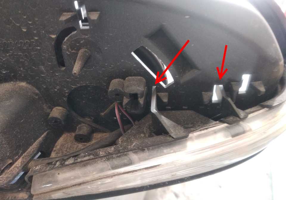 Для замены указателя поворотов нужно снять верхнюю часть наружной пластиковой крышки зеркала. Она также крепится на защелках, которые нужно поддеть тонкой плоской отверткой. Расположение защелок следующее:
