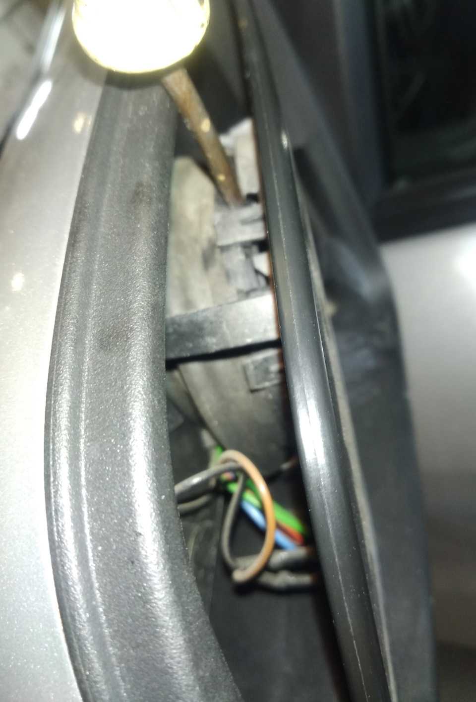 1-й шаг: повернуть зеркальный элемент в бок до самого упора, чтобы вынуть его (провода подогрева отражателей можно не отсоединять);