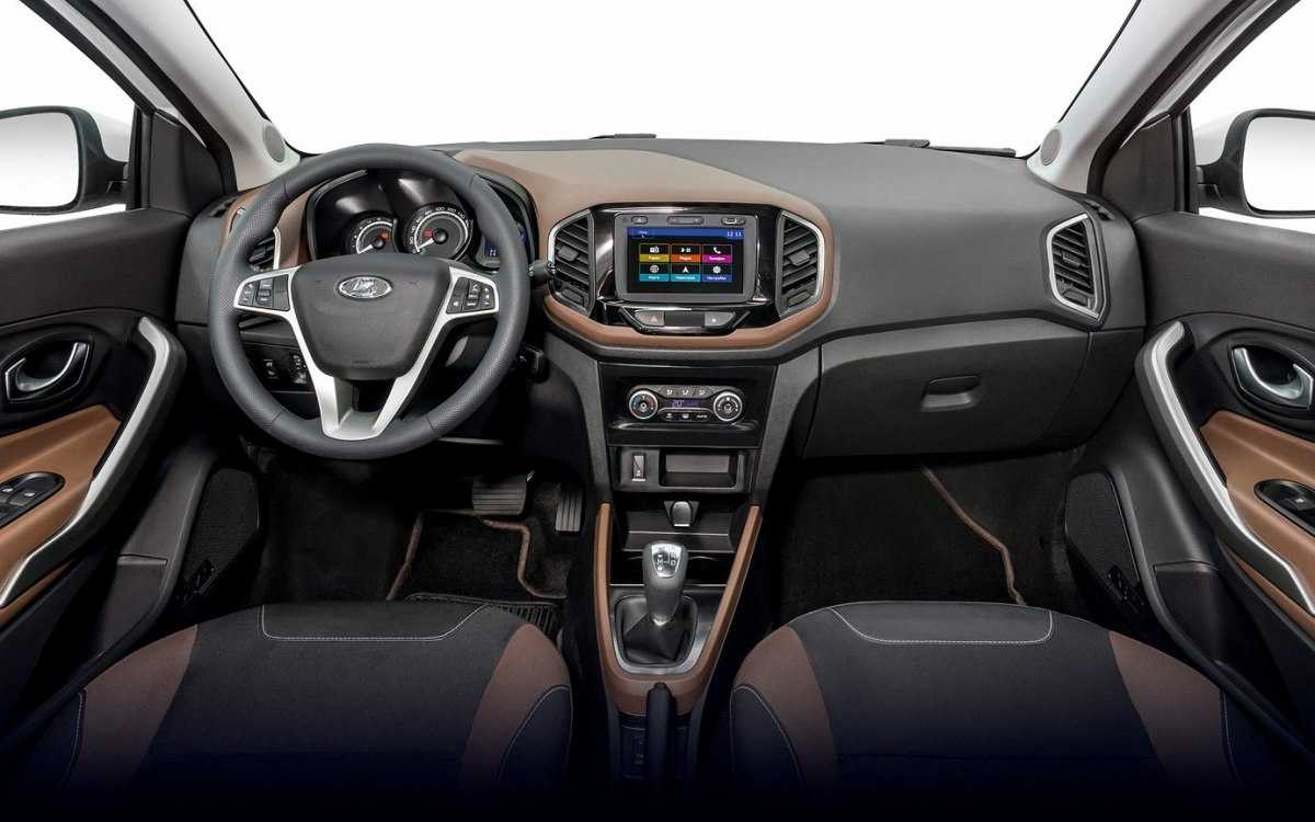 Отделка интерьера отечественного хэтчбека повышенной проходимости выполнена в двухцветном исполнении, а в наиболее топовых модификациях салон получит еще и декоративные вставки. Передняя панель оснащена классической аналоговой «приборкой», а также мультимедиа системой с поддержкой сервиса Яндекс.Авто.