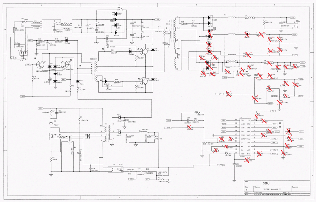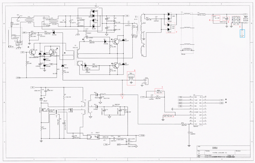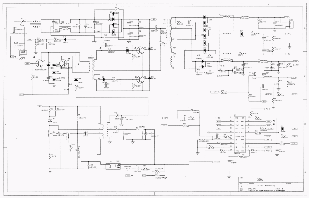Ниже приведена схема COLORSit 330U-FNM на ШИМ SG6105, плата этого блока точно совпадает со схемой.