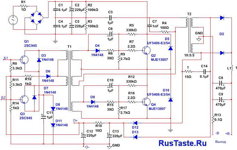 Здесь показана схема устройства, созданного на основе устаревшего компьютерного АТ блока питания на IC TL494 с выходной мощностью 200 Вт гарантирующий ток, примерно 11 — 13А.