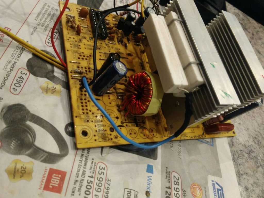 Управляющая плата установлена на коротких проводниках из медной проволоки, на плате есть переменный резистор для точной настройки выходного напряжения