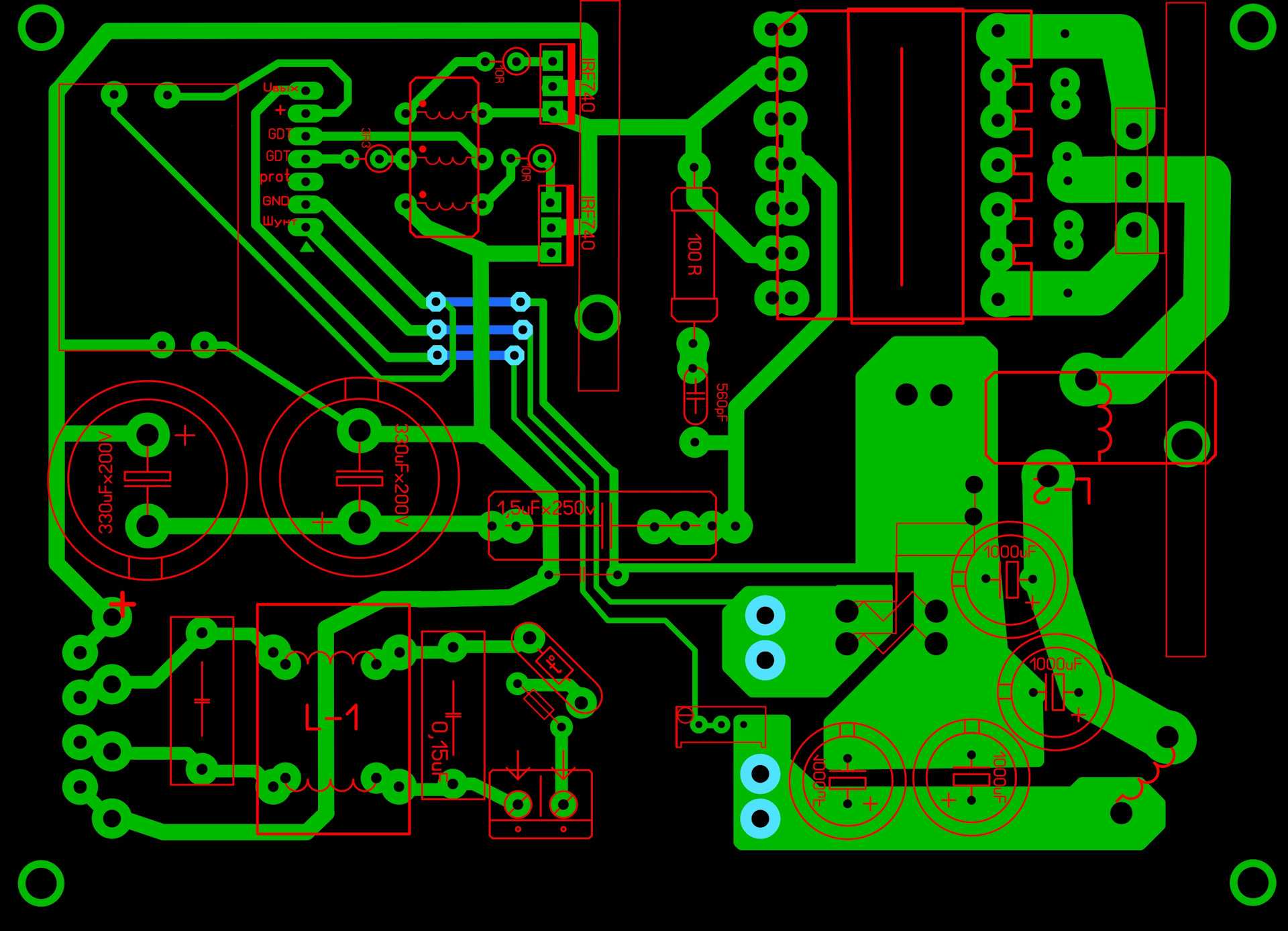 16-я ножка TL494 подключается на минусовый выход после шунтов (обозначенная синей рамкой), место подключения вывода к 16 ножке тоже обозначено и указанно на схеме. R4 используется для регулировки напряжения, а R10 для регулировки тока. Расчет обвязки выполнен для выходного напряжения 0-17 В; 0-15 А. Печатку для переходника с регулировкой тока можно будет скачать в конце статьи.