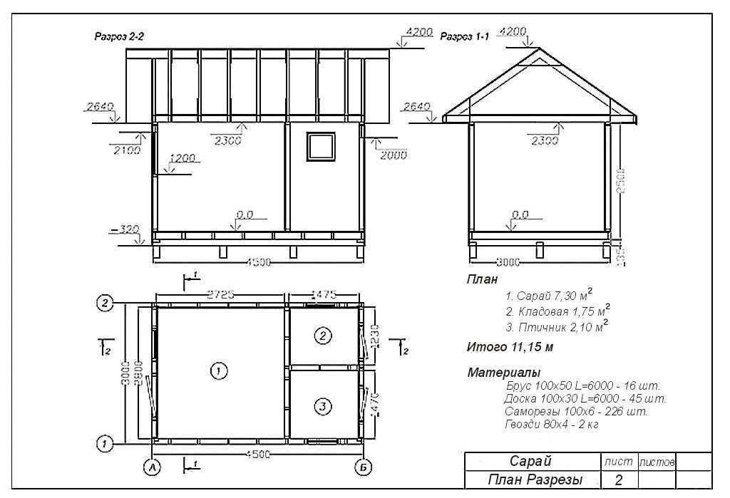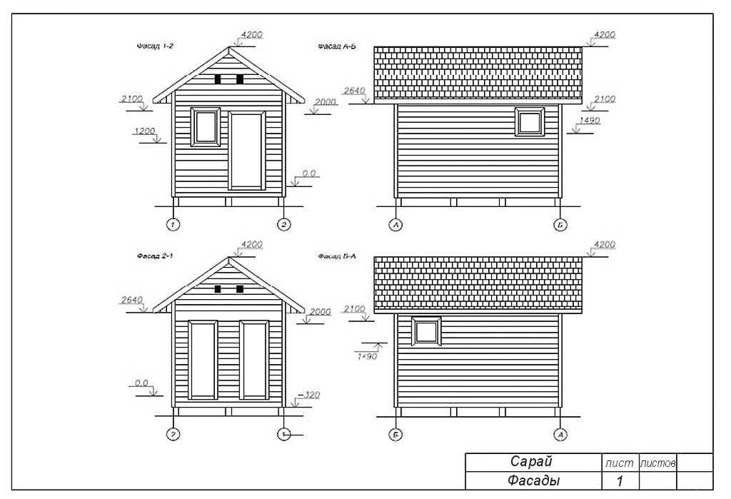Сарай – легкое быстровозводимое не отапливаемое нежилое строение, из чего следуют важные облегчающие дело следствия. О них для строительства речь впереди, а пока нужно знать, что при оформлении/узаконивании наибольших придирок и сложностей следует ожидать по привязке на местности в соответствии с СанПиНами. Собственно проект сарая должен включать в себя листы с фасадами, план с разрезами, см. след 2 рис. и план-схему фундамента со спецификацией материалов на него, как на рис. с план-разрезами.