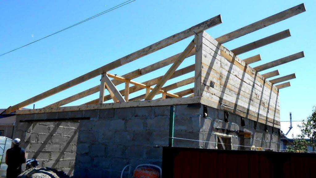 Если сооружается сарай из бетонных блоков, то на противоположных стенах следует установить и закрепить опорный брус-мауэрлат. Что касается каркасных конструкций, то роль опорных брусьев выполняет верхний обвязочный брус.