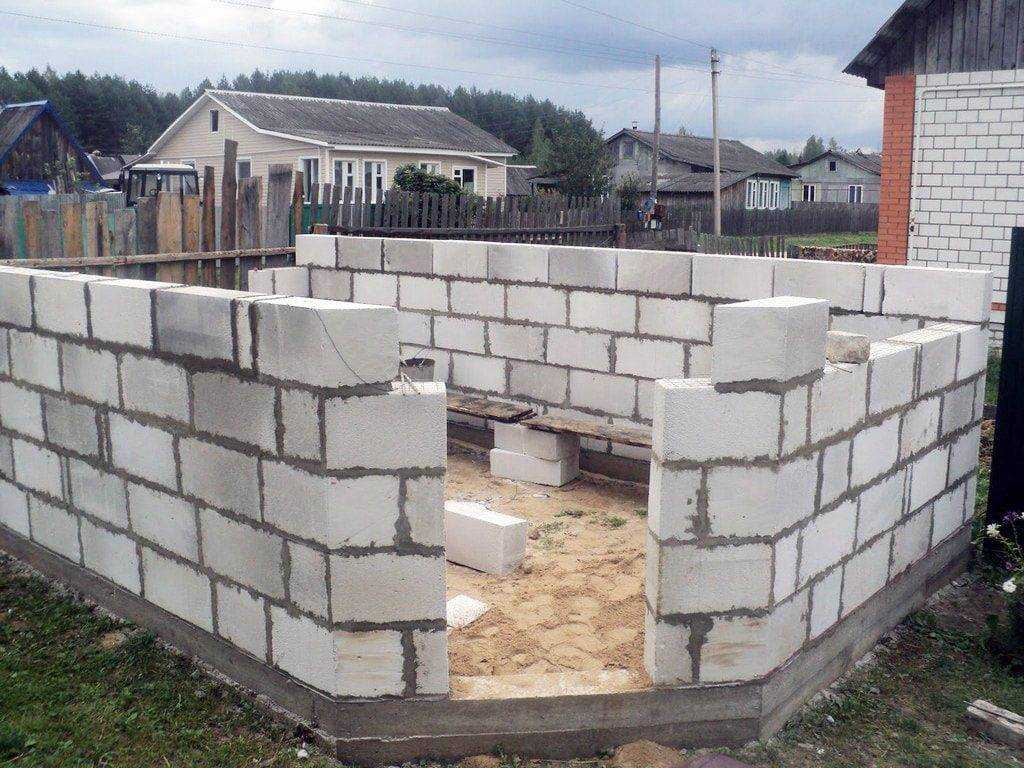 По истечении данного периода основу накрывают двумя слоями рубероида и начинают укладывать на них пеноблоки, предварительно обмазывая их специальным клеевым средством, который можно приобрести в любом строительном супермаркете. Возводить стены следует с углов, постепенно двигаясь в разные стороны.