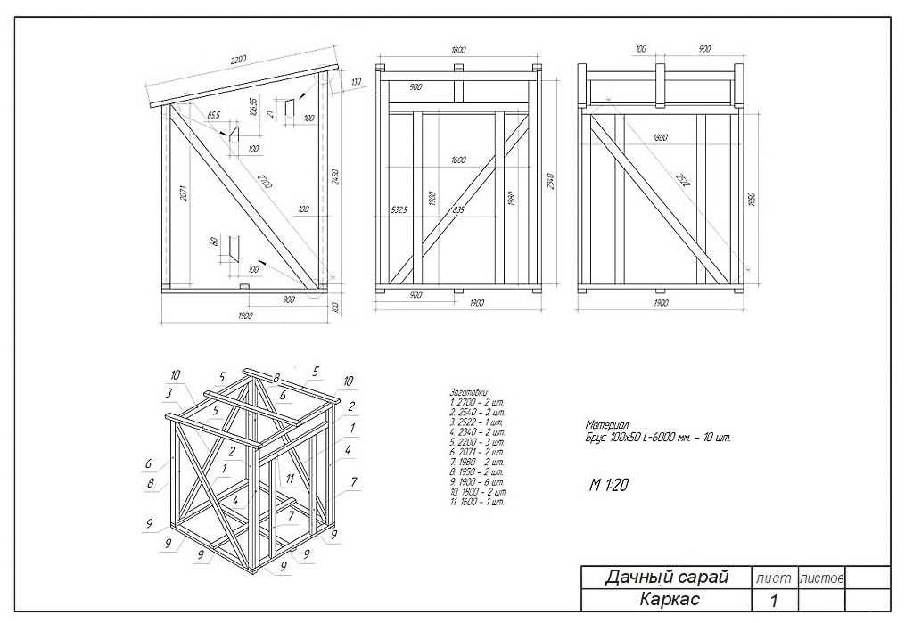 Возможно, въедливый чинуша потребует еще лист с конструкцией каркаса, т.к. нежилое-то оно нежилое, но люди туда заходят. На такой случай для образца – чертежи на рис. Кстати, это совсем неплохая сарайка для 6-соточной дачи. На крайний случай там и спать можно, улегшись по диагонали.